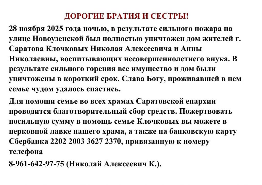 Саратовская епархия проводит сбор средств для помощи семье учащегося православной гимназии 02.12.2025, 20:22 Новости храма СМОТРЕТЬ ВИДЕОПредыдущая новостьВ храм Вмч. Георгия Победоносца доставлен ковчег с частицей мощей Блаженной Матроны МосковскойСледующая новостьРасписание совершения таинства Соборования в Рождественский пост