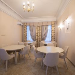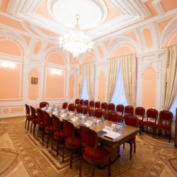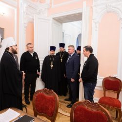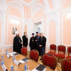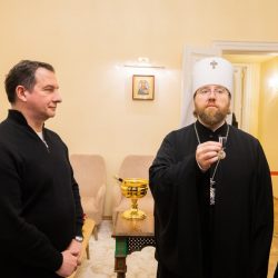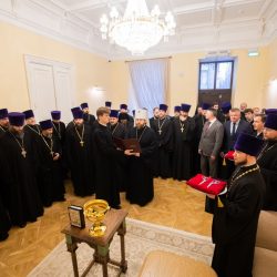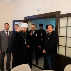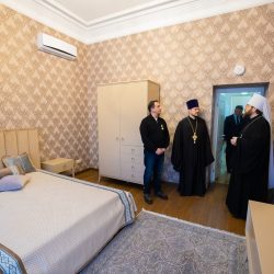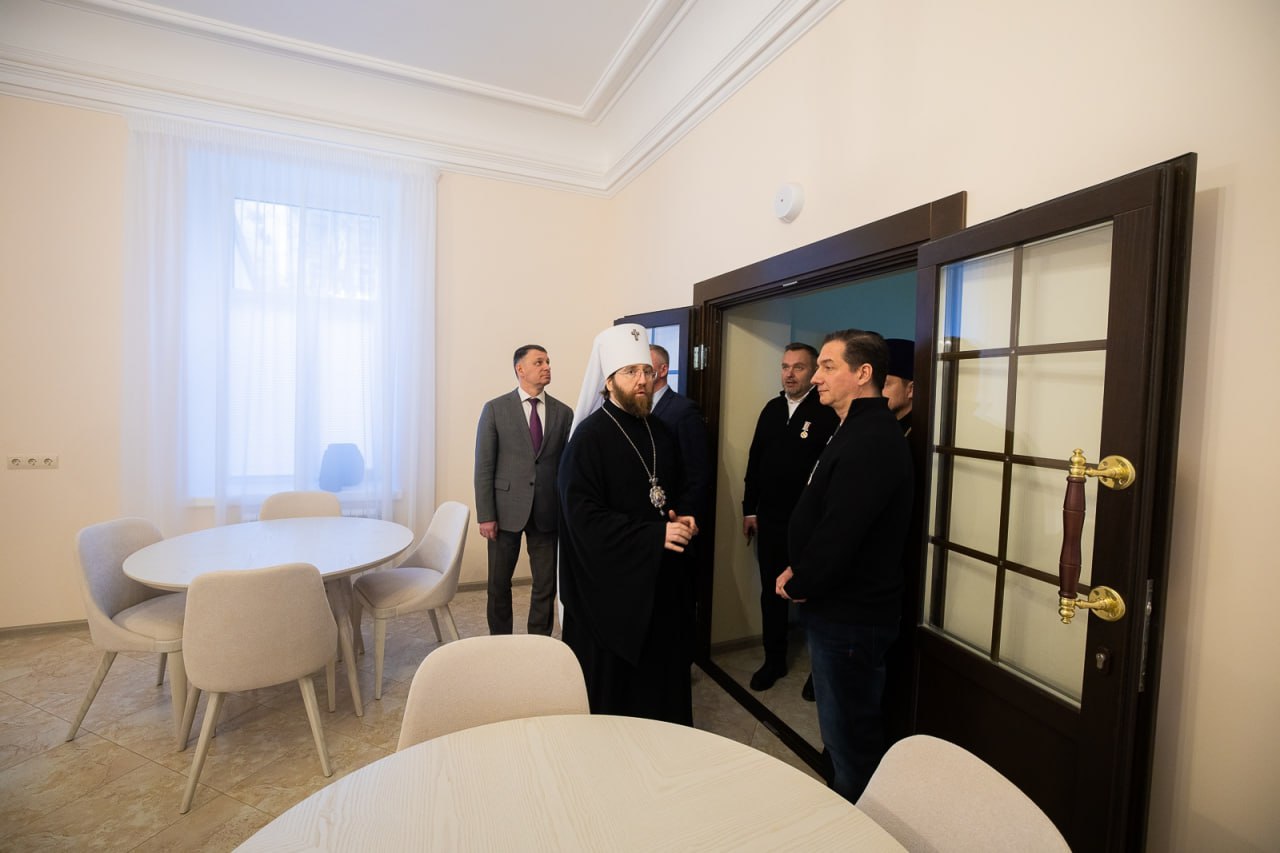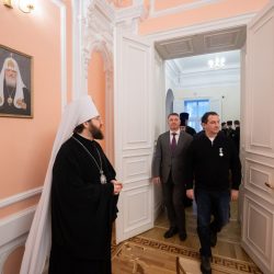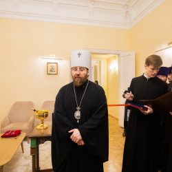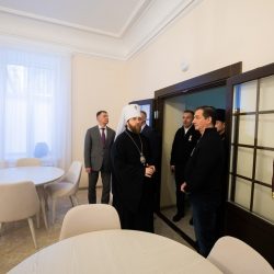 В завершение мероприятия была торжественно перерезана красная лента, и архипастырь, пастыри и гости осмотрели новый епархиальный центр. В нем обустроены зал заседаний с полукруглыми сводами, украшенными старинной роскошной лепниной, уютная комната для переговоров и другие полезные помещения. Затем в обновленном зале заседаний состоялось Административное совещание Саратовской епархии под председательством главы митрополии.