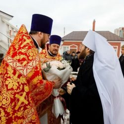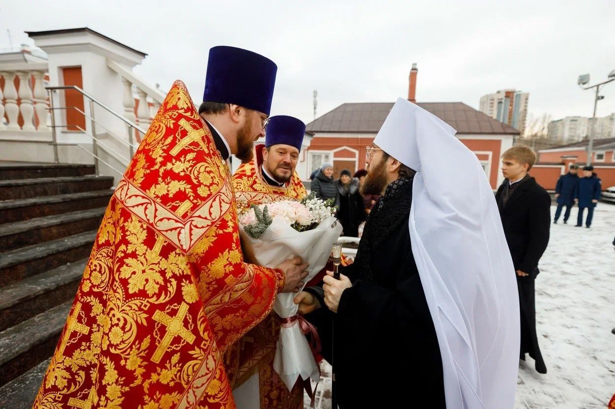 Его Высокопреосвященству сослужили секретарь Саратовского епархиального управления, благочинный Саратовского Центрального округа, настоятель Свято-Духовского собора г. Саратова иерей Александр Чеботарёв; благочинный Саратовского Северного округа, председатель финансово-хозяйственного управления Саратовской епархии, настоятель собора иерей Олег Грушин; благочинный Саратовского Северо-Западного округа, помощник епархиального архиерея по богослужебным вопросам, руководитель епархиального отдела по взаимодействию с Главным управлением МВД России по Саратовской области и духовному окормлению его подразделений и епархиального отдела по взаимодействию с Управлением Федеральной налоговой службы по Саратовской области иерей Алексий Булеков; благочинный Саратовского Юго-Западного округа, заместитель председателя финансово-хозяйственного управления Саратовской епархии иерей Павел Тараканов; руководитель административного секретариата Саратовской епархии, руководитель епархиального отдела по взаимодействию с Управлением специальной связи по Саратовской области, председатель комиссии по сохранению мощей и древних святынь Саратовской епархии иерей Сергий Феофанов; первый заместитель секретаря Саратовского епархиального управления, постоянный специальный представитель Главы Саратовской митрополии по вопросам взаимодействия Саратовской епархии с учреждениями здравоохранения федерального подчинения, расположенными на территории города Саратова, иерей Даниил Коньков; заместитель секретаря Саратовского епархиального управления, руководитель епархиального отдела по взаимодействию с Главным управлением МЧС России по Саратовской области и духовному окормлению его подразделений иерей Владимир Петриченко; руководитель службы протокола Саратовской епархии, секретарь комиссии по сохранению мощей и древних святынь Саратовской епархии, настоятель крестового храма священномученика Гермогена, епископа Тобольского (Саратовского и Царицынского), при Саратовском епархиальном управлении, клирик собора иерей Григорий Родихин; клирик Свято-Троицкого кафедрального собора г. Саратова протодиакон Александр Пушкарёв; клирик Казанского храма г. Саратова протодиакон Олег Дроздов; директор и художественный руководитель Архиерейского мужского хора Саратовской митрополии диакон Иоанн Горбач; клирик Свято-Троицкого кафедрального собора г. Саратова диакон Павел Кулик.