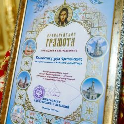 Владыка поблагодарил благотворителя Виктора Ивановича Назарова за приглашение на эту значимую службу хора Сретенского монастыря, что позволило большому количеству людей в этот день не только помолиться, но и приобщиться к высокой православной музыкальной культуре. Митрополит Игнатий отметил, что хор прибыл в Саратов, чтобы в этот день также дать концерт для участников, ветеранов СВО и их семей. Коллективу хора была вручена Архиерейская грамота за многолетние усердные труды во благо Церкви Христовой и активную деятельность по сохранению духовных традиций и песенной культуры России.