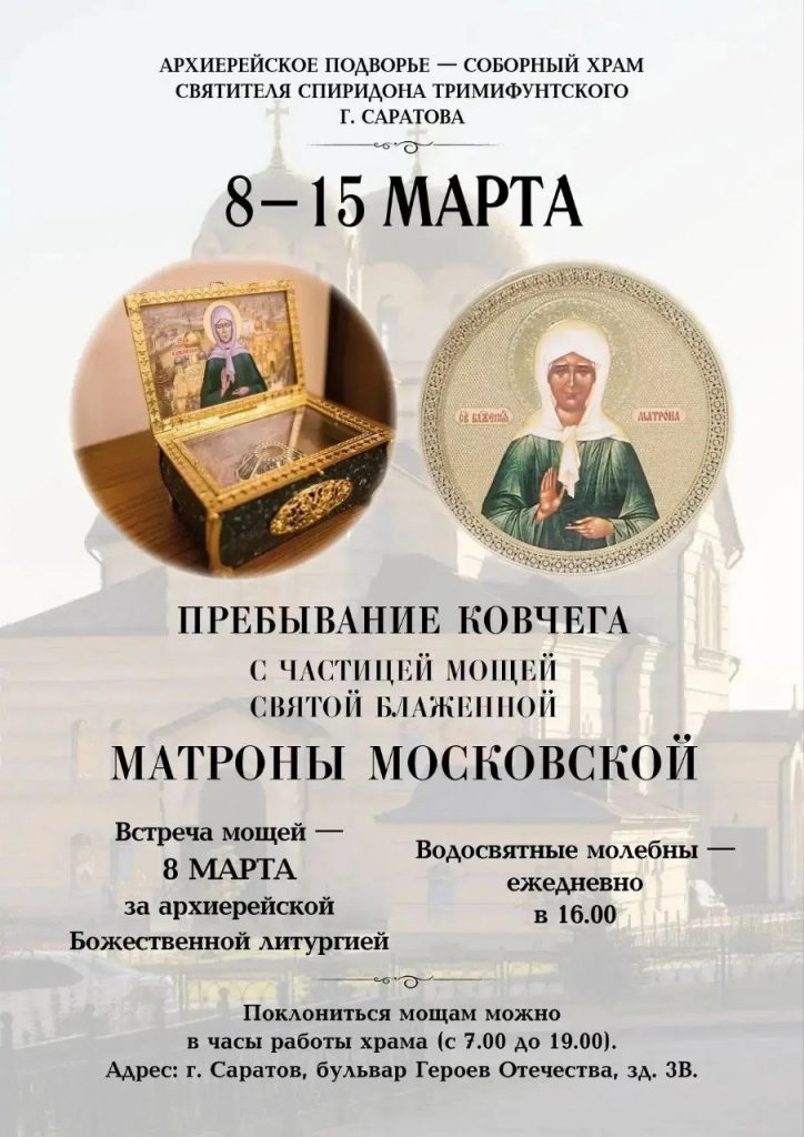 С 8 по 15 марта в соборном храме святителя Спиридона Тримифунтского г. Саратова будет пребывать ковчег с частицей мощей блаженной Матроны Московской. Встреча святыни состоится 8 марта за Божественной литургией, которую совершит митрополит Саратовский и Вольский Игнатий (начало в 9.00).